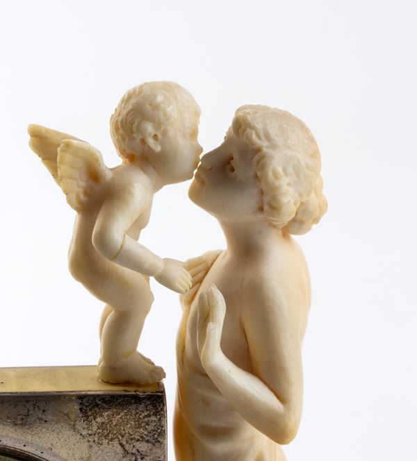 Rectangular silver case, with base, in yellow guilloché enamel; the watch with a white enamel dial and Arabic numerals; on the left side of the front an elephant ivory sculptural group (Elephas maximus Linnaeus, 1758 or Loxodonta africana Blumenbach, 1797) depicting a Venus with a winged putto.