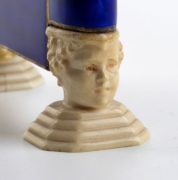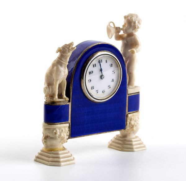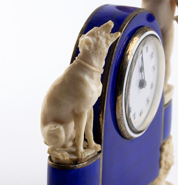 Silver case of rounded form with blue guilloché enamel resting on two lateral elephant ivory carvings (Elephas maximus Linnaeus, 1758 or Loxodonta africana Blumenbach, 1797) depicting a musician putto and a dog; the watch with white enamel dial and Arabic numerals.