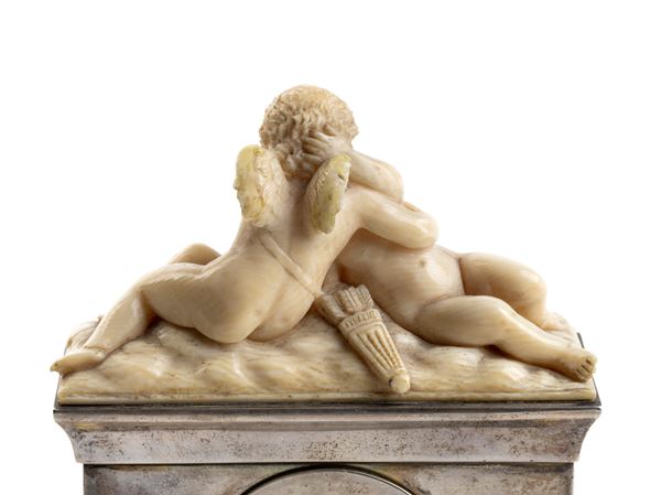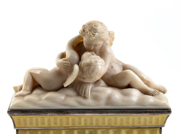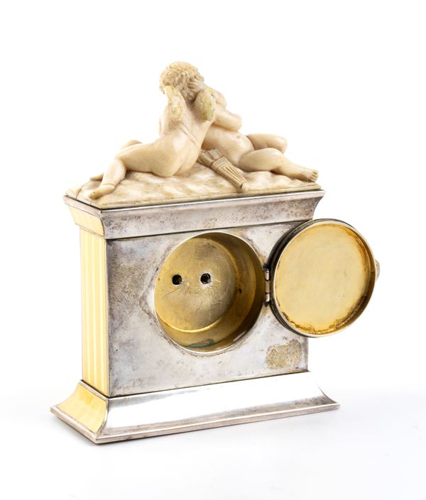 Rectangular silver case with yellow guilloché enamel, topped by an elephant ivory sculptural group (Elephas maximus Linnaeus, 1758 or Loxodonta africana Blumenbach, 1797) depicting love and psyche; the watch with white enamel dial and Arabic numerals. Key set and wind. On the reverse side the dust flap.