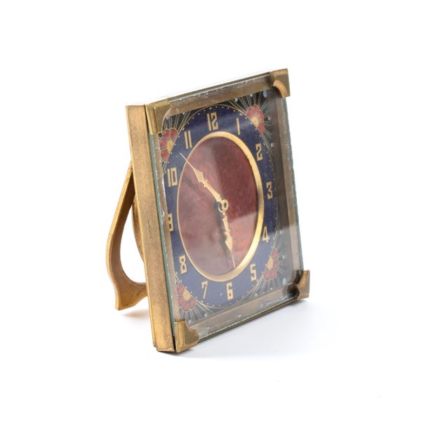 Square brass case, dial with polychrome enamel on the sides and central guilloché enamel in shades of red, blue bezel with Arabic numerals and golden hour markers.