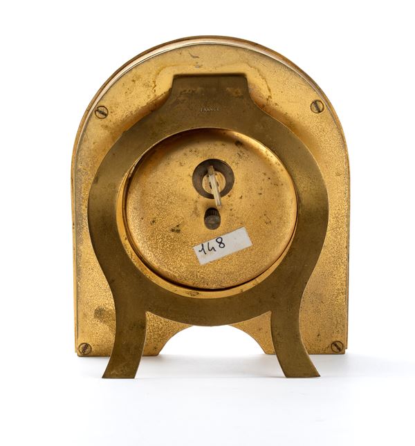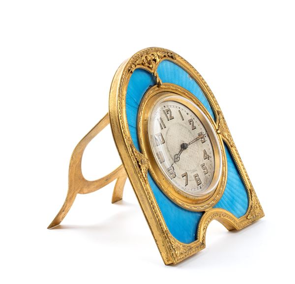 Shaped case in gilded metal with guilloché enamel in shades of blue, silvered dial with Arabic numerals and luminous hour markers. On the back of the case "France".