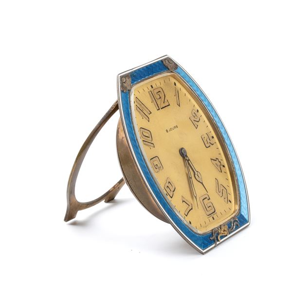 Oval brass case with perimeter decoration in guilloché enamel in shades of light blue, golden dial with Arabic numerals and luminous hour markers, featuring the inscriptions "8 Days - Swiss Made". Inside the stand, the inscriptions "C.H - Depose - 259 - France".