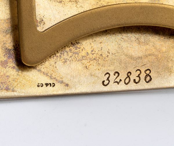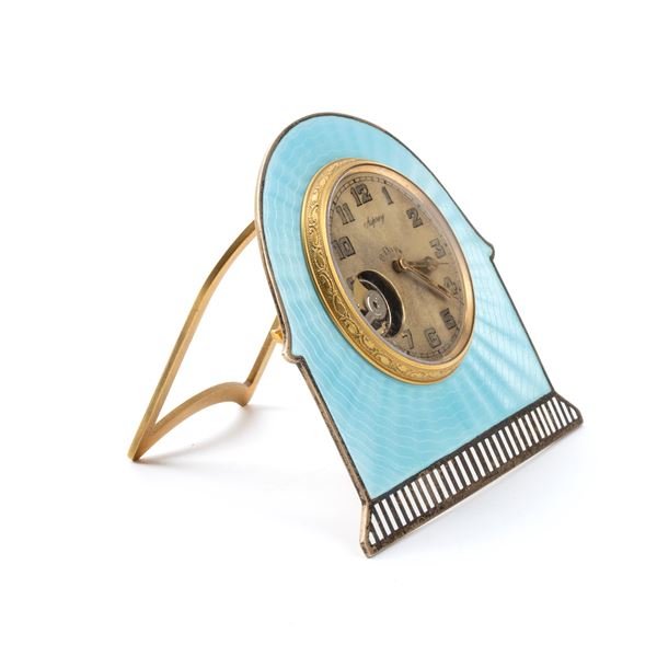 Gilded metal case with blue guilloch" enamels, gilded dial with Arabic numerals and visible balance bearing the inscription "Asprey - 8 Days Swiss". On the back, "32838 - Metal doré - Cl & Co".