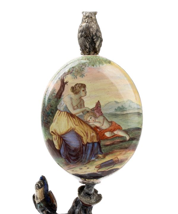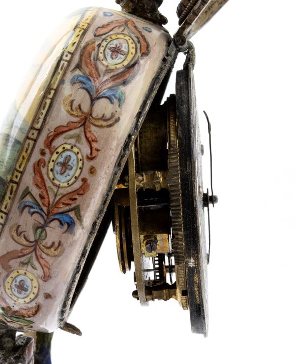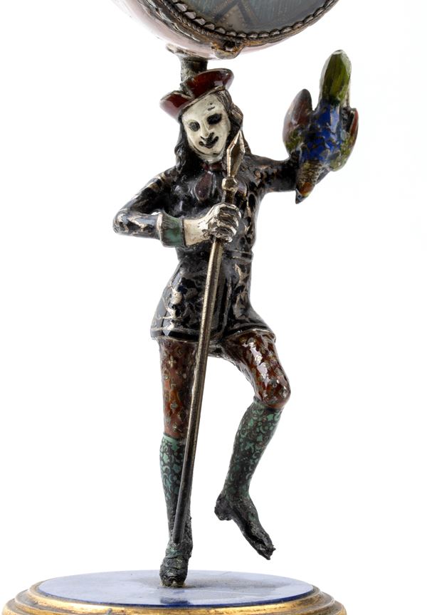 Square lapis lazuli base with rounded corners, supported by four spherical feet. Empire-style gilded bronze plinth upon which stands a male figure decorated in polychromy. Clock case decorated with polychrome enamels and a genre scene topped by an owl. Gilded dial with polychrome enamels, Roman numerals, black hour markers, and a winding hole at 3 o'clock. Conoidal movement.