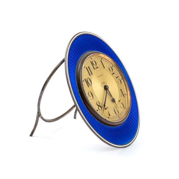 Sterling silver case with guilloché enamel in shades of blue, gold dial with Arabic numerals and luminous hour markers, with the inscriptions "Finnigans - 8 Days - Swiss Made".