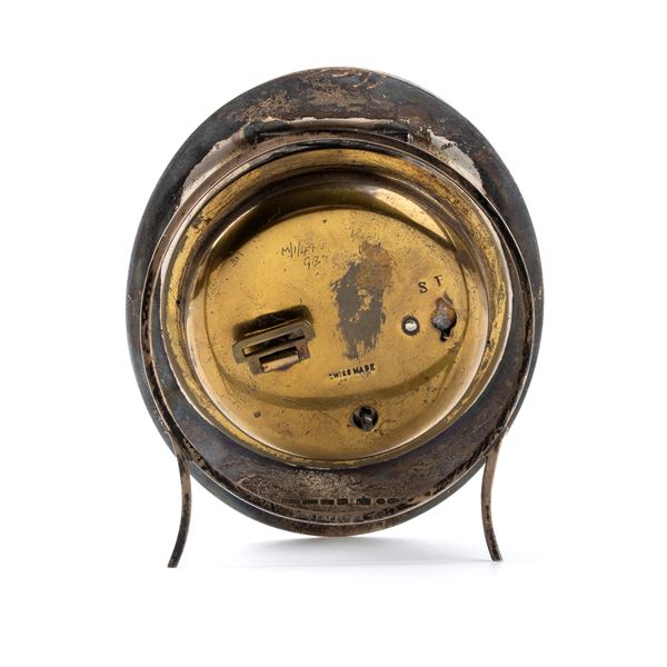 Art Déco sterling silver and enamels table clock, Import London, 1928