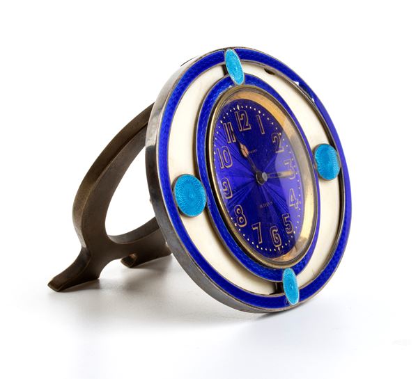 Art Déco silver, ivory and guilloché enamels table clock, France, 1920s - 1930s