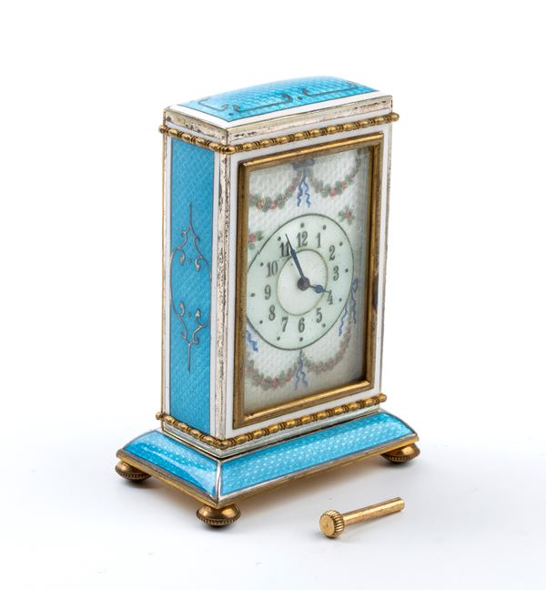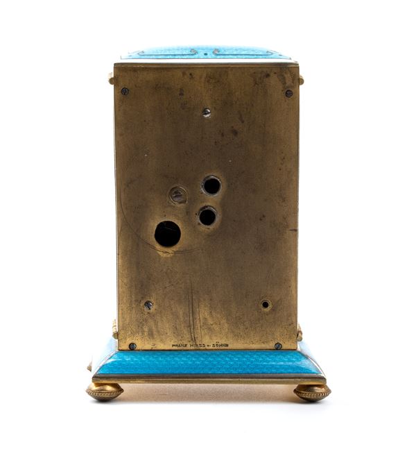 Rectangular case entirely enameled with guilloché enamels in shades of blue and white enamel frames. Dial with guilloché enamels in shades of white, featuring polychrome garlands, Arabic numerals, and black hour markers. On the bottom of the brass case, "Franz Hiess Söhne". The watch is key wound and set.
