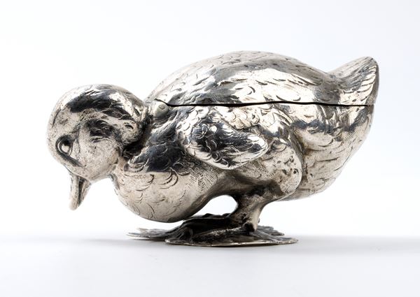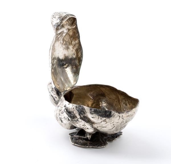 duck shaped, resting on a leaf-shaped base, with hinged lid on the back.