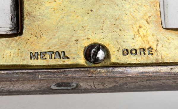 Silver and brass square case with rock crystal and enamels in the shades of white and red; mother-of-pearl dial with Arabic numerals bearing the inscription "Mappin & Webb - Paris London - 8 Days".