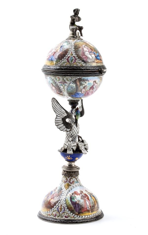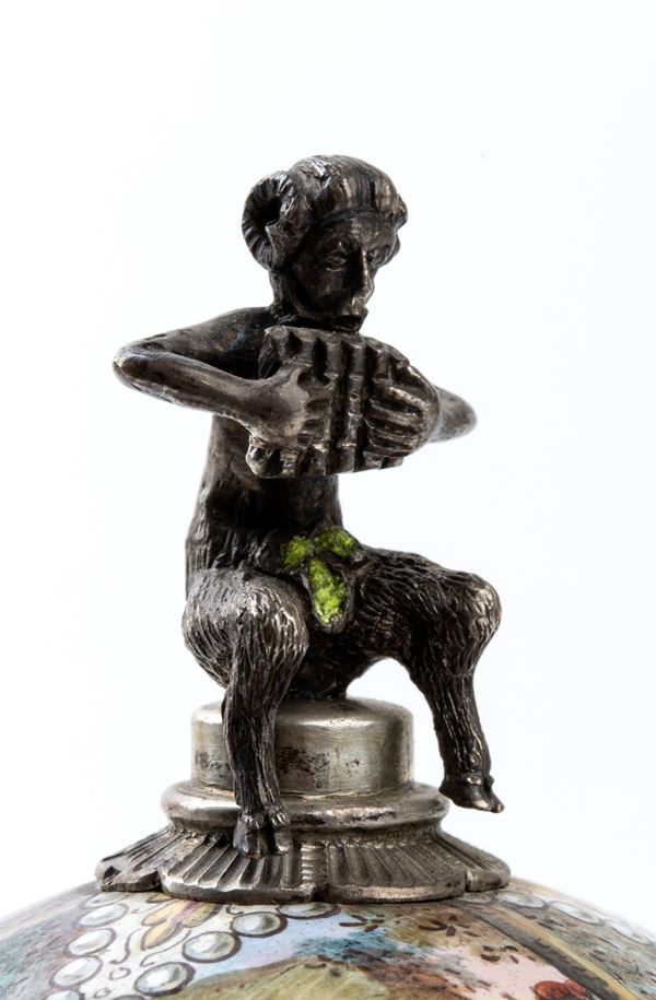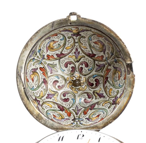 Case in silver with a base and body enameled in polychrome, featuring mythological scenes connected by an eagle. White enamel dial with Arabic numerals, missing minute hand, and a winding hole at 5 o'clock. Conoid movement, key wound and set.