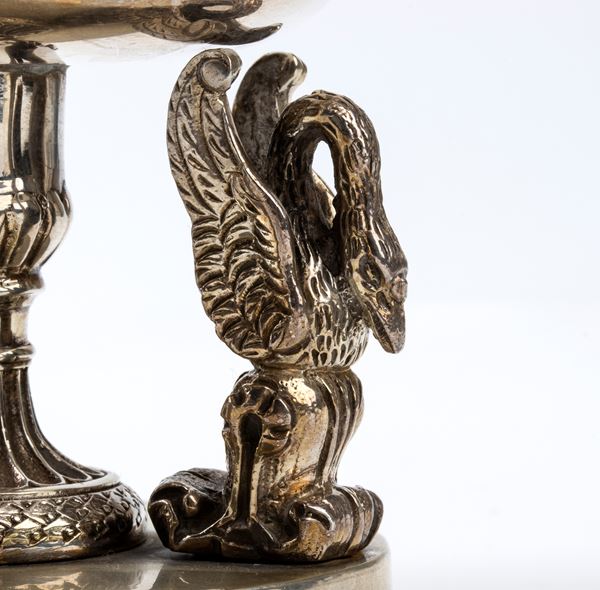 of circular form of Empire style, column shaft with three swans, circular basins with gilded interior and perimeter palmette decoration.