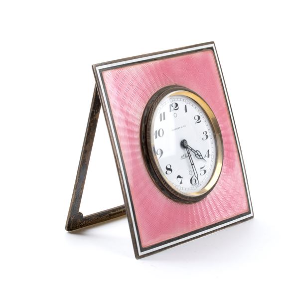Square case in sterling silver with guilloché enamel in shades of pink with white and black borders, white enamel dial with Arabic numerals and black hour markers, featuring the inscriptions "Tiffany & Co. - 8 Days - Swiss".