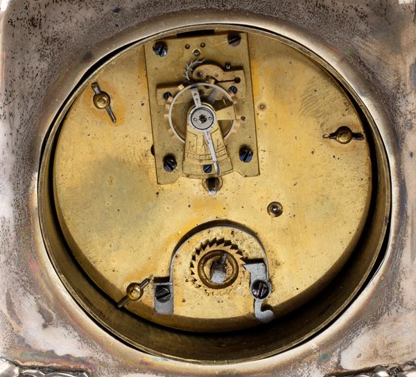 Sterling silver case embossed and chased with floral motifs, mounted on four claw feet. White enamel dial with black Roman numerals and gold hour markers, featuring a green enamel bezel. The watch is key wound and set.
