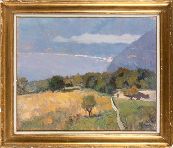 Signed lower right: Novello; signed and dated on the back: Giuseppe Novello, Il lago Maggiore da Agra, 1970