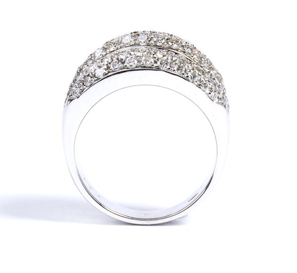 designed as a rounded triple row bombe style ring in 18k white gold, gently tapering in width and pavรฉ set with round brilliant cut diamonds.