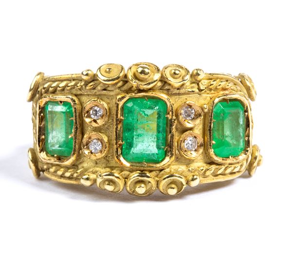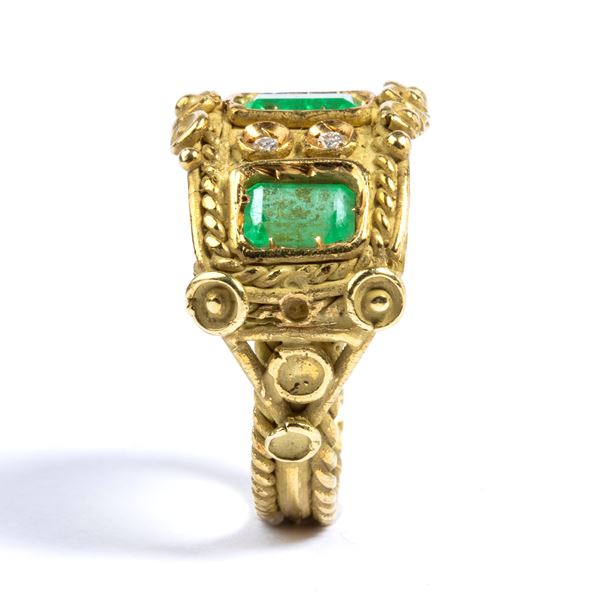 18k yellow gold, set with three emeralds surrounded by two couple ofdiamonds; decorations using the micro granulation technique and in cord motifs.