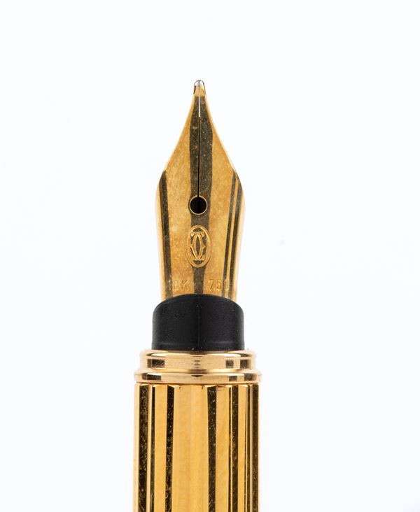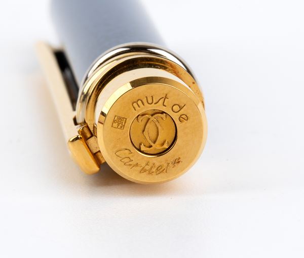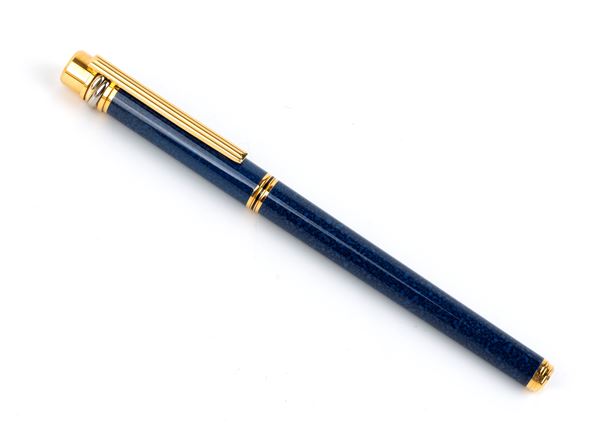 Blue body and cap with goldplated clip and details, rhodium-plated 18k gold nib marked "18K - 750 - Cartier logo." Serial number B36969.