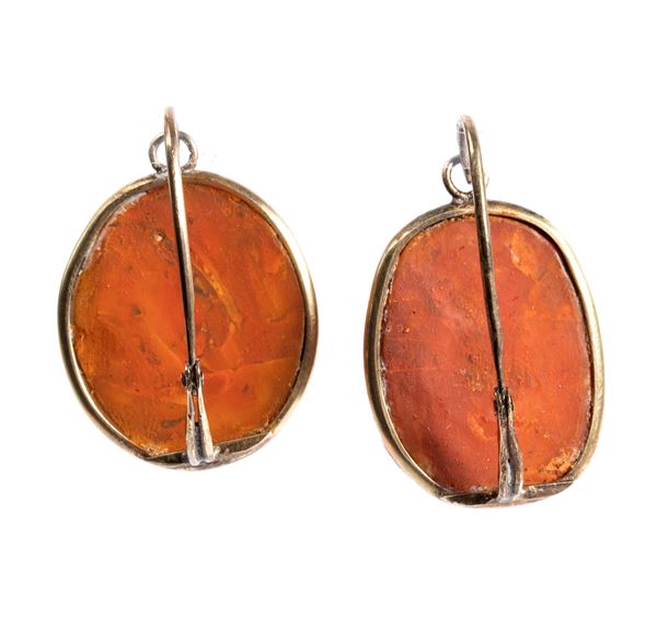 low fineness gold setting with two centra cameos in Mediterranean coral (Corallium Rubrum) depicting two female figures.