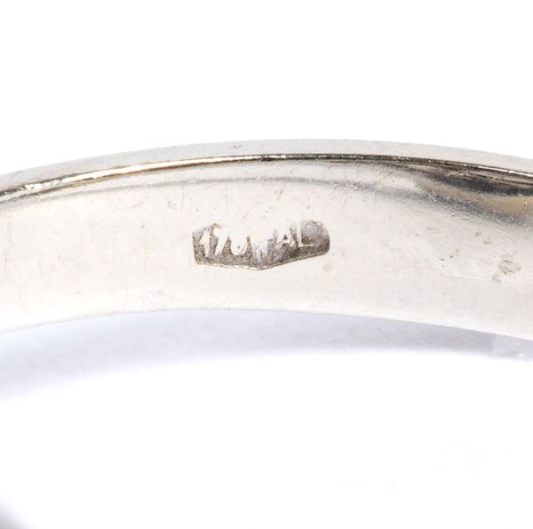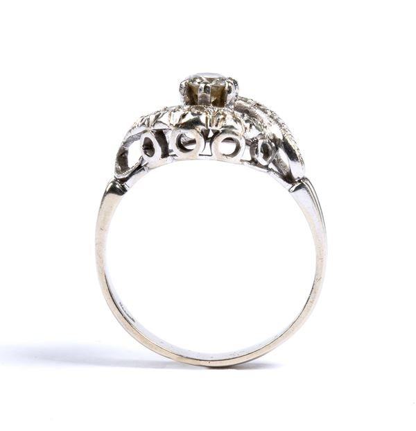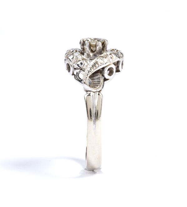 set with a central brilliant-cut diamond surrounded by huit-huit cut diamond ribbons.
