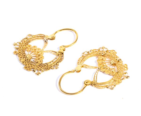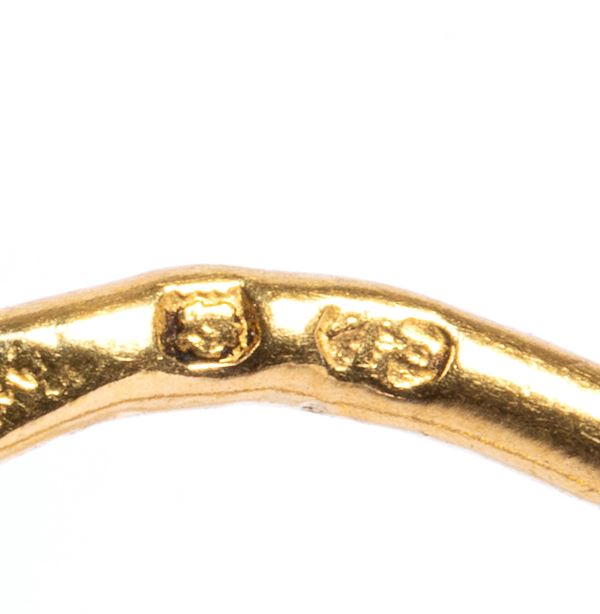 high fineness gold, basket-shaped, decorated with spiral motives resembling stylized flowers, worked in filigree.