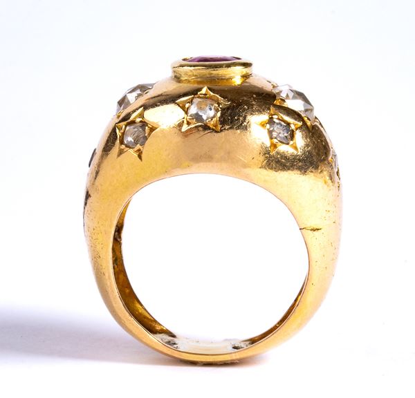 set with central oval shaped ruby surrounded by rose and old mine cut diamods.