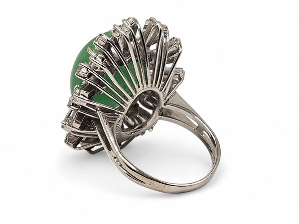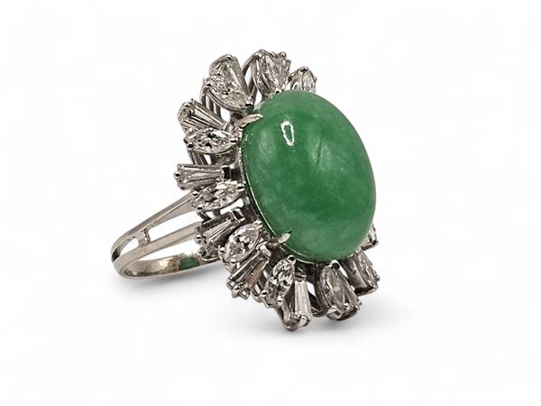 18k white gold, flower motif set with cabochon cut green jadeite surrounded by brilliant cut navette and tapered cut diamonds.