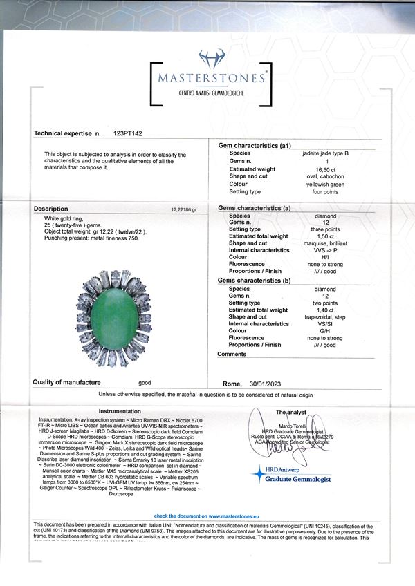 N. 12 diamonds, navette shape, modified brilliant cut, n. 12 diamonds, trapezoidal shape, steps cut weighing a total of approximately 2.90 ct, colour G-I, clarity VVS-I, as measured and graded in the setting.
