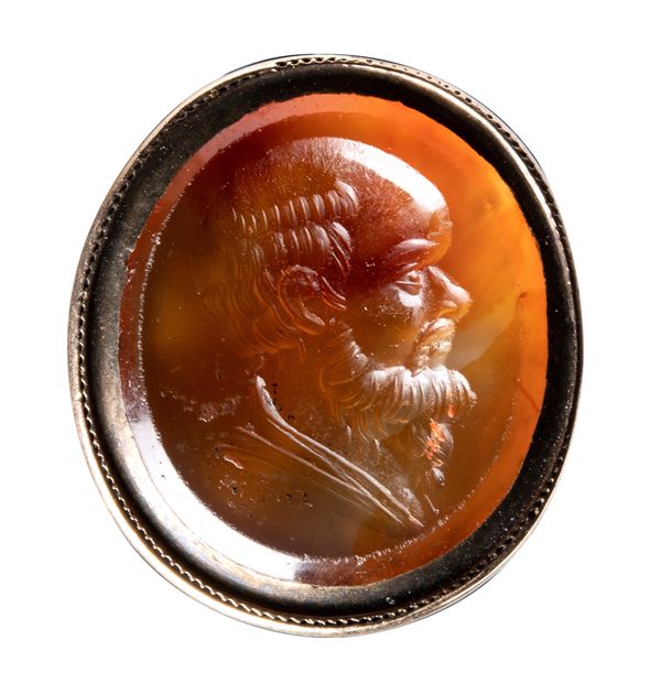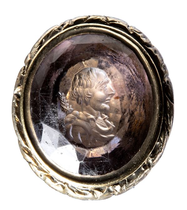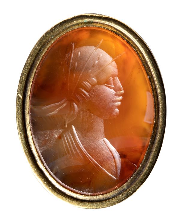 low fineness gold, composed by three seals three seals respectively engraved in amethyst, carnelian and agate, depicting three different male's profiles.