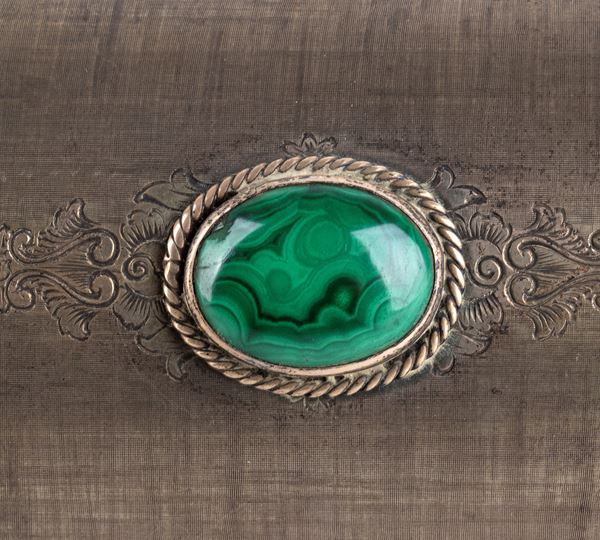 consisting of a rectangular-shaped, floral-decorated card holder; a rectangular-shaped, satin-finished, floral-decorated liquor bottle and box with malachite cabochon on the lid, blue fabric interior, fitted with an opening key.
