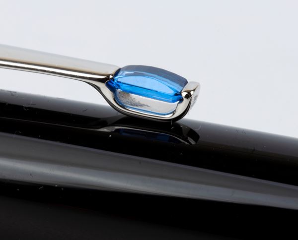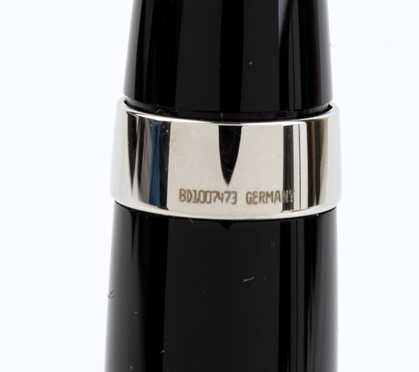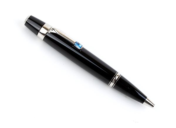 Fine black resin body with steel trim embellished with a blue topaz on the clip, inlaid white Montblanc star. Montblanc box, slipcase and papers. Number BD1007473 GERMANY.