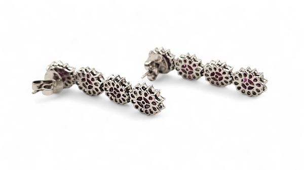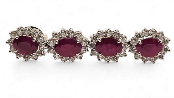 white gold, each with a line of four flower motifs set with oval rubies framed by brilliant-cut diamonds.