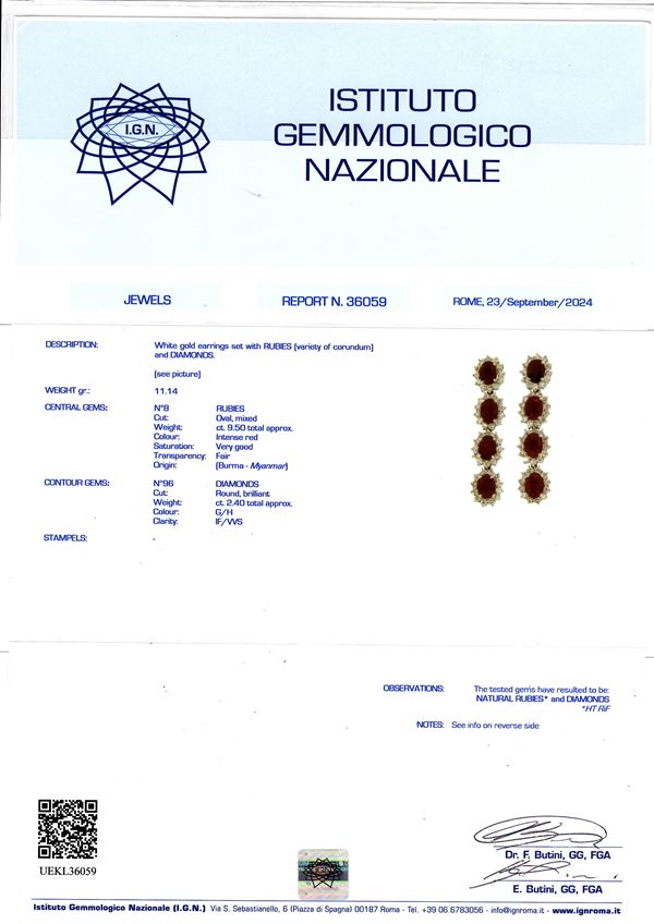 N. 96 diamonds estimated to weigh a total of approx. 2.40 ct, G-H colour, IF-VVS clarity, and n. 04 rubies estimated to weigh a total of approx. 9.50 ct, as measured and graded in the mount.