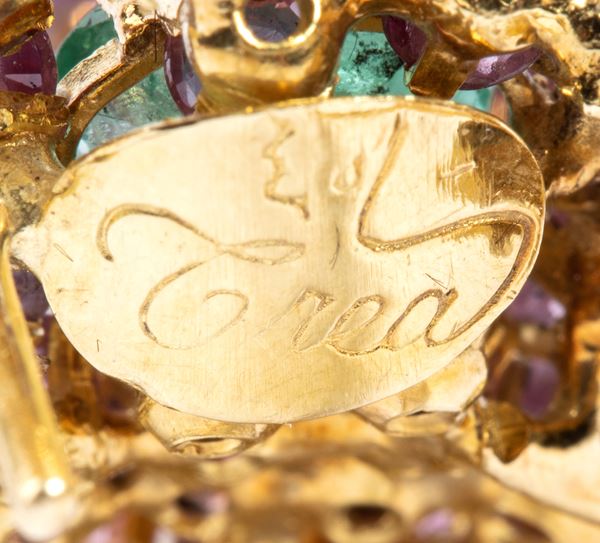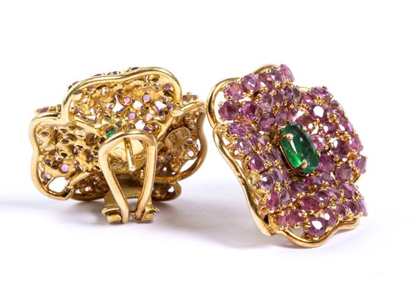 18k yellow gold, each set with central oval emerald between roun rubies pavรฉ petals.