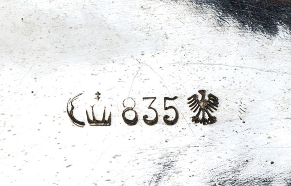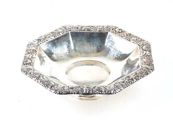Octagonal basket, silver 835/1000, hallmarked with German marks in use since 1888; dimensions 7 x 26 x 26 cm.