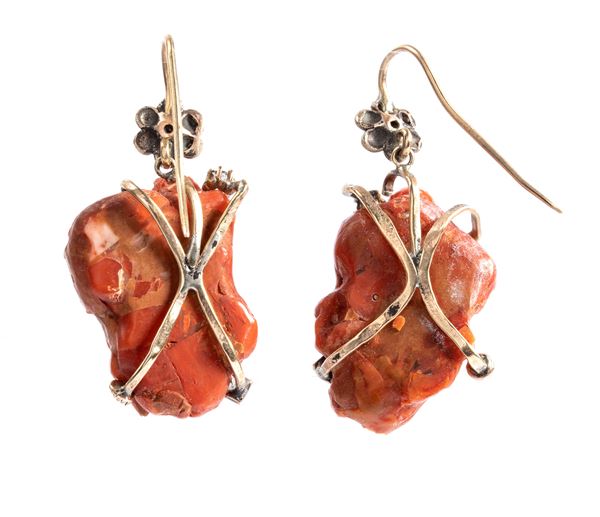 Low fineness gold setting, each with one carved Mediterranean coral (corallium rubrum) depicting a flying cherubs holding bouquets of flowers, adorned with rose-cut diamonds