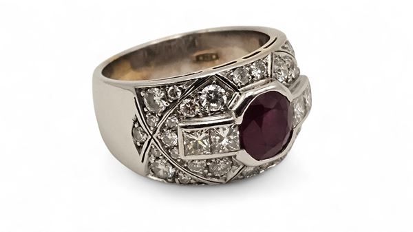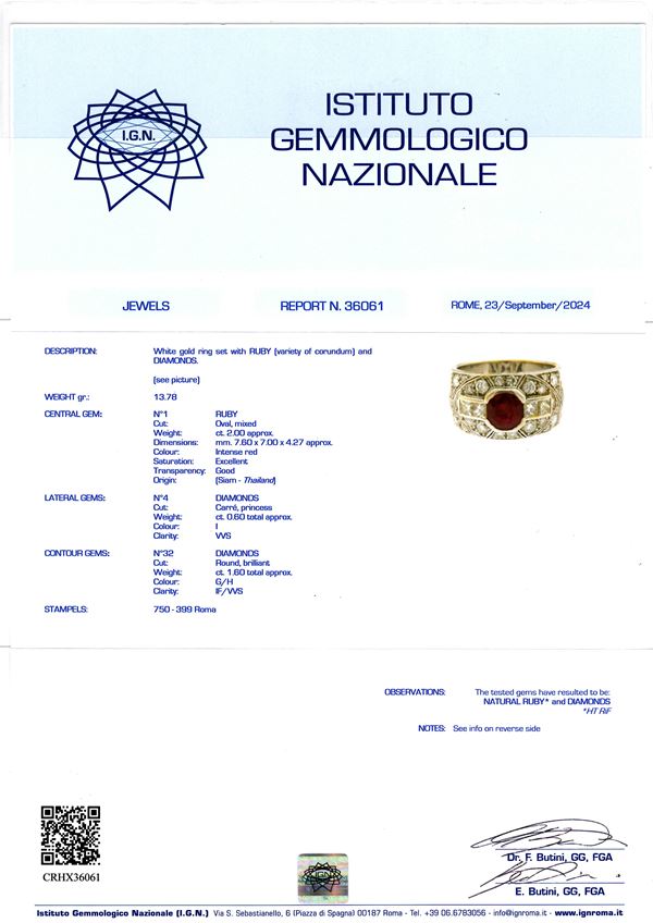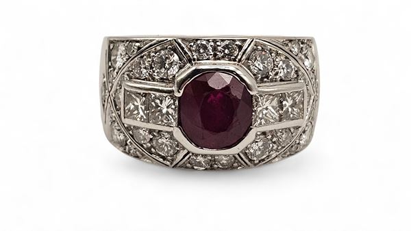 N. 32 diamonds, billiant cut, estimated to weigh a total of approx. 1.60 ct, G-H colour, IF-VVS clarity and n. 01 ruby estimated to weigh approx. 2.00 ct, as gauged and graded in the mount.