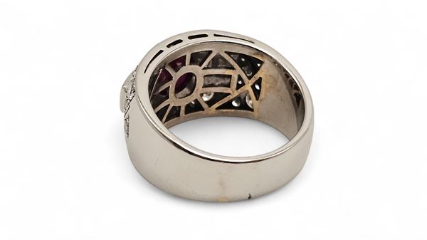 fashioned as an 18k white gold band, set with oval ruby flanked by line of four princess-cut diamonds and surrounded by pavΓ© set round brilliant-cut diamonds.