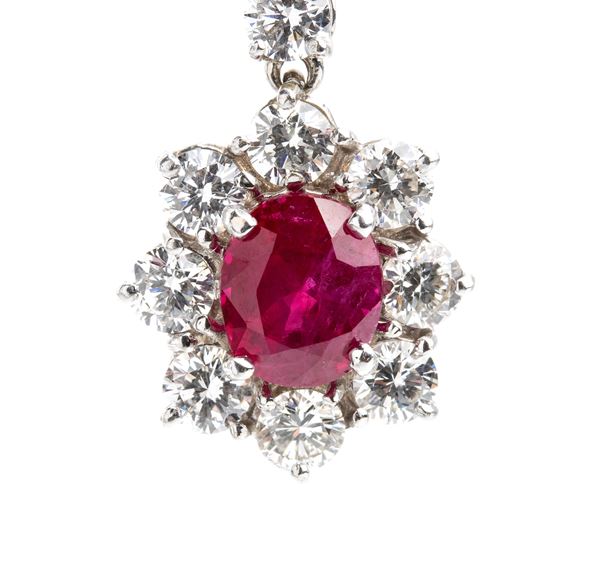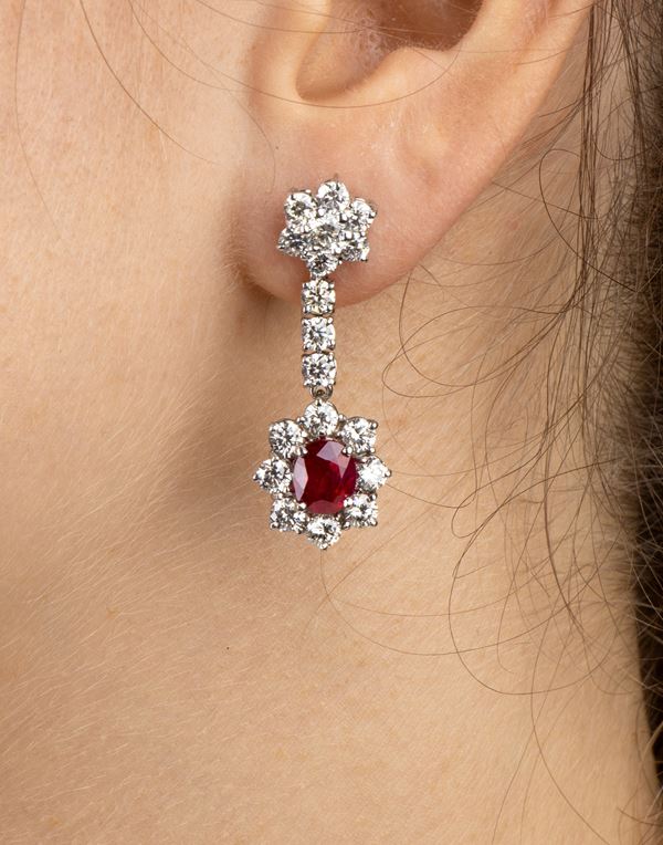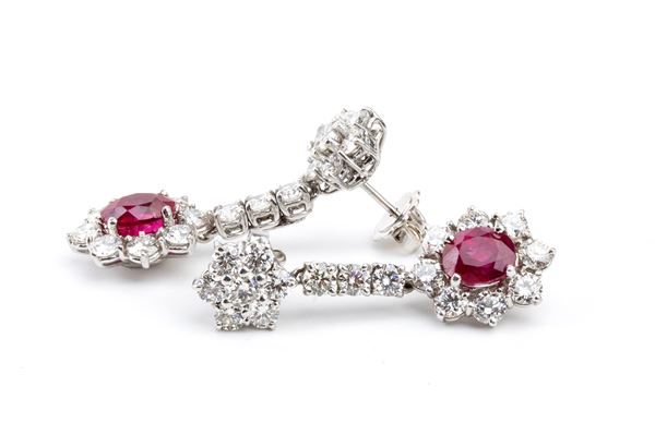 18k white gold, each embellished by one ruby surrounded and surmounted by diamonds.