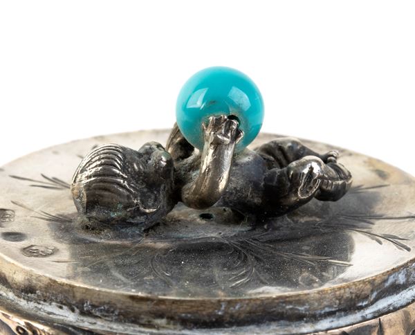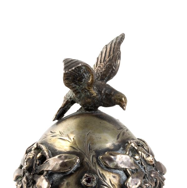 cast silver with plug-in closure, decorated with vegetal festoons and topped with an eagle, resting on a tripod stand with vegetal scrolls.