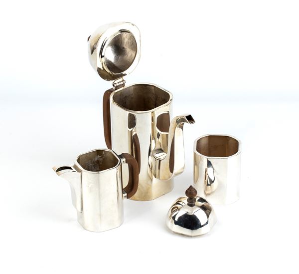 Composed of a teapot, a milk jug and a sugar bowl. Bodies with a square base. Wooden handles and grips.