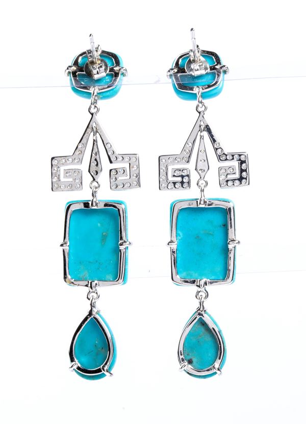 i8k white gold, each with a line of geometric cabochons cut natural turquoise and round brilliant-cut diamond ribbons.