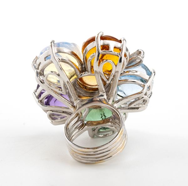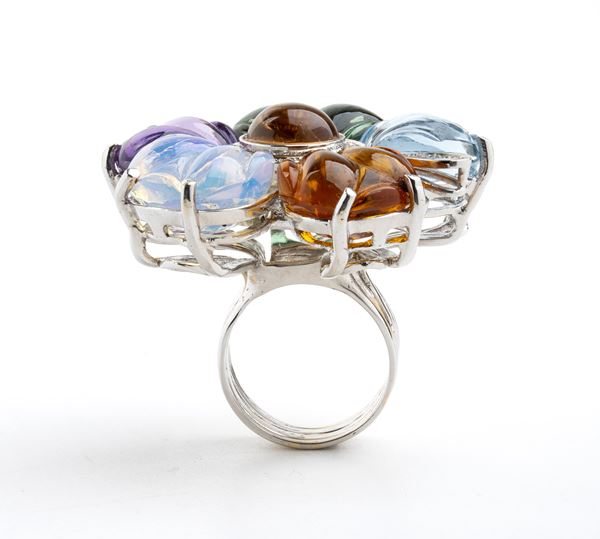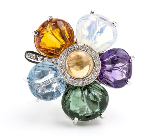 18k white gold, featuring a flower with petals in glass pastes, diamonds details.