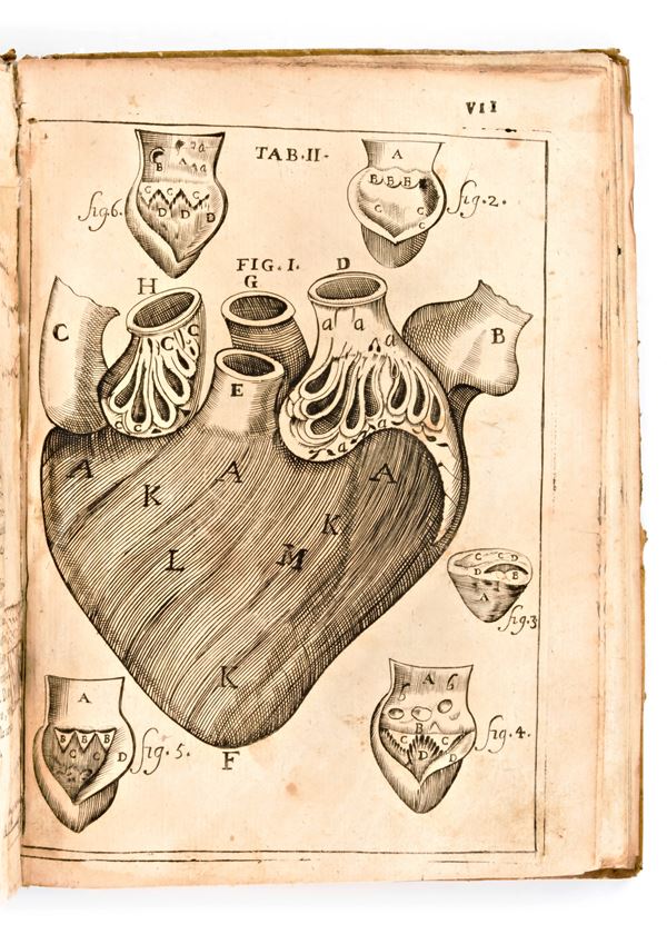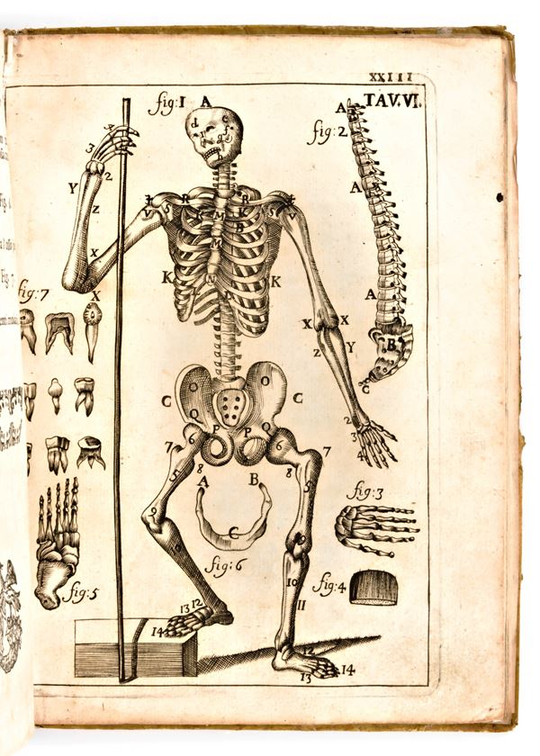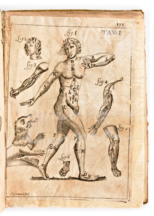 Engraving frontispiece and 1 portrait of the Author drawn by Giuseppe Laudati and engraved by Girolamo Frezza. 19 anatomical plates engraved outside the text. Woodcut headpieces, initials and endpieces. Work of Alessandro Pascoli (1669-1757), an Italian anatomist, who taught in Rome and Perugia. He gave anatomical demonstrations by dissecting cadavers, like his colleague and competitor Andrea Vesalio. Finally, with its own frontispiece, a 58-page text by the anatomist Giorgio Baglivi (1668-1707): Georgii Baglivi ... De fibra motrice, et morbosa; nec non De experimentis, ac morbis salivae, bilis, & sanguinis... Perusiae, apud Costantinum anno Jubilei, 1700.