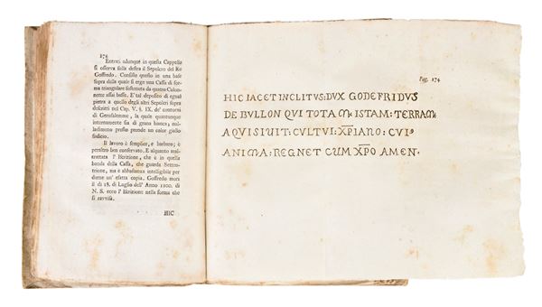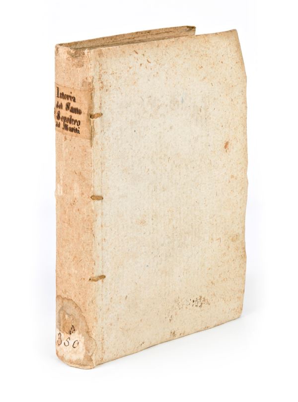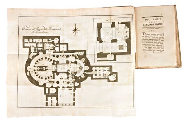 In-8ยฐ, mm. 220x150, pp. XVI, 356, (2), 4 cc. of folding plates. Contemporary hardback with handwritten titles on a tag on the spine. Work printed in Livorno in 1784 at Carlo Giorgi by the Royal Palace. With 1 large plan folded several times of the Temple of the Resurrection in Jerusalem (Basilica of the Holy Sepulchre) and 3 other folding plates depicting epigraphic inscriptions (p. 132, p. 174, p. 175). Bound at the end, with its own frontispiece: Chronology of the Latin Kings of Jerusalem 1784. In-8ยฐ, pp. vi, 103. The volume describes various stories linked to the Temple of the Resurrection in Jerusalem, such as the capture of Jerusalem during the Crusades by Godfrey of Bouillon, as well as analyzing the Masonic symbols to indicate specific places within the Holy City. What makes this copy truly unique, rarely put on sale, is the presence of 4 plates folded several times, unlike the copies of Yale and Washington University which contain only 1 plate.