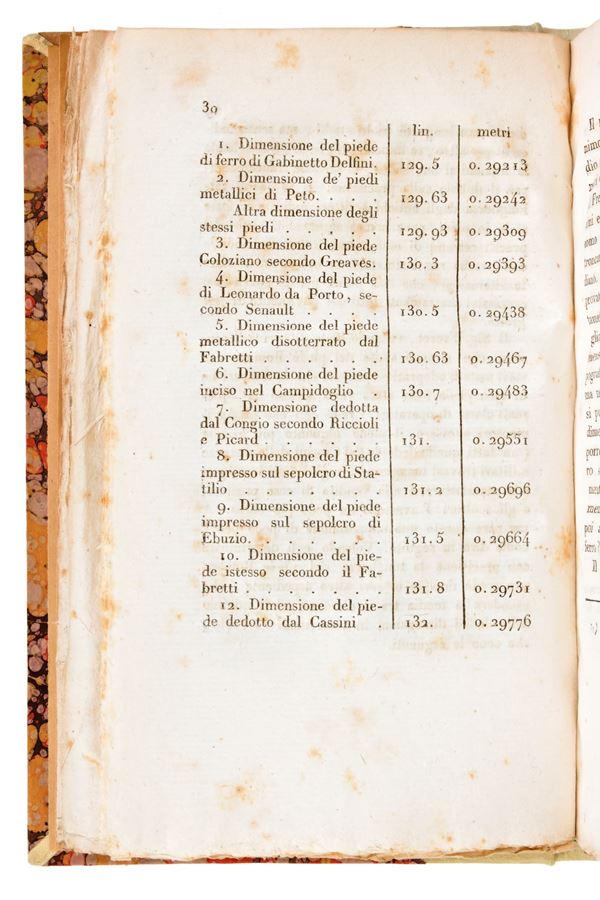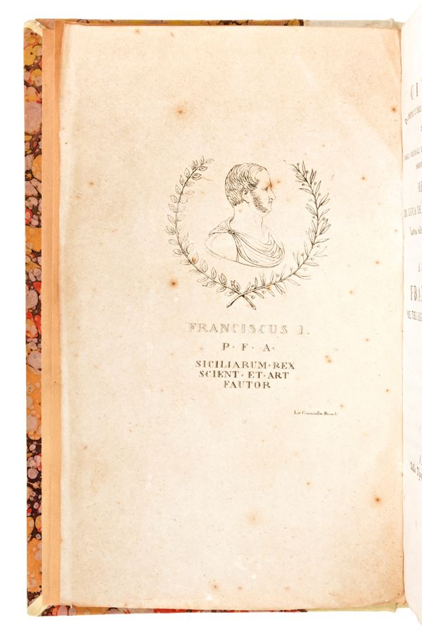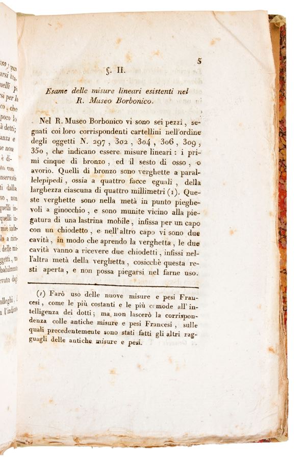First edition printed in Naples in 1825 for Angelo Trani, report on the weights and measures of the ancient Romans, from the finds of the Royal Bourbon Museum of Naples, coming from Herculaneum and Pompeii, work of Luca De Samuele Cagnazzi (1764-1852), Italian mathematician, statesman and politician. With 1 lithographic portrait on the frontispiece of Francis I of the Two Sicilies and 1 folding chalcographic plate at the end.
