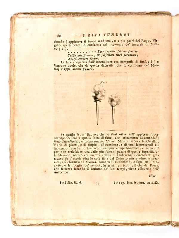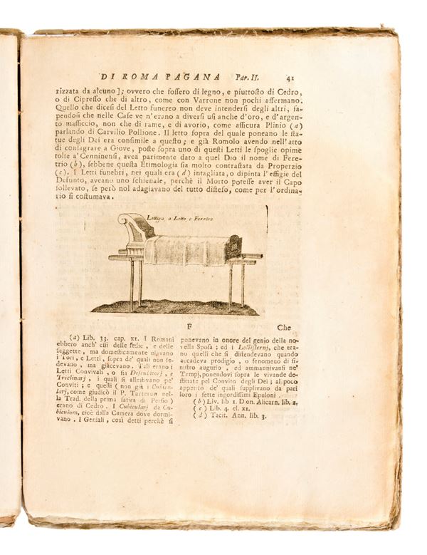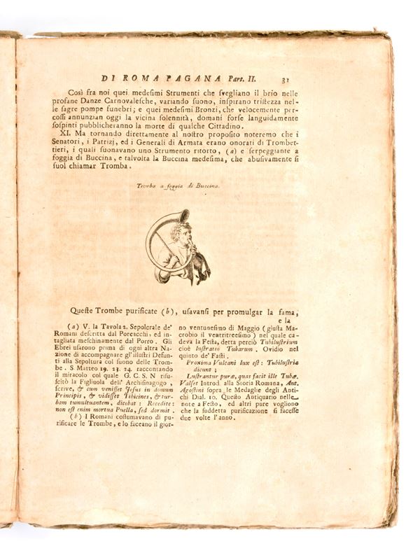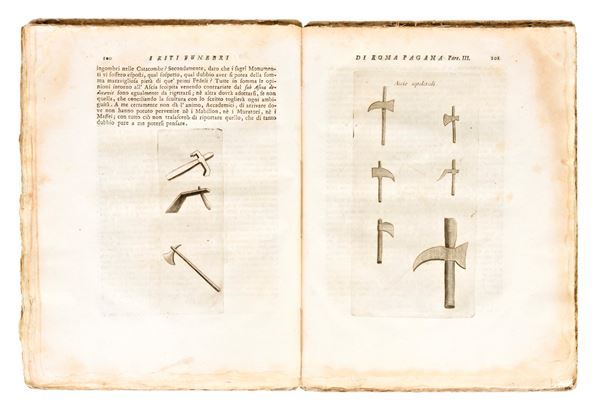 Old edition printed in Lucca in 1758 for Filippo Maria Benedini, work of the Italian historian Francesco Eugenio Guasco (1725-1798), with 11 figures engraved in chalcography in the text depicting the various instruments for the rites of the ancient Romans (burial axe, cinerary urn, gestatorial chair, pyre, torches, aspergillum and others). Large woodcut frieze on the frontispiece. Headers, initials and endpieces in woodcut.