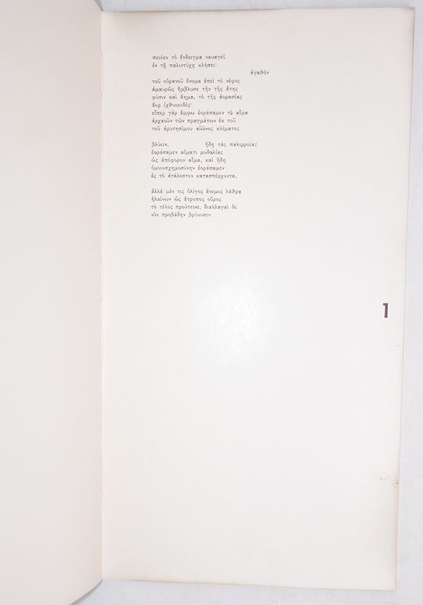 Editorial paperback, in-4°, cm. 32x19, pp. (24) unnumbered on heavy coated paper, 2 illustrations. 8 poems in Greek, with Italian translation at the end of the volume. An original autograph dedication and pen numbering 32/150 by the author in the colophon. Signs of the times.