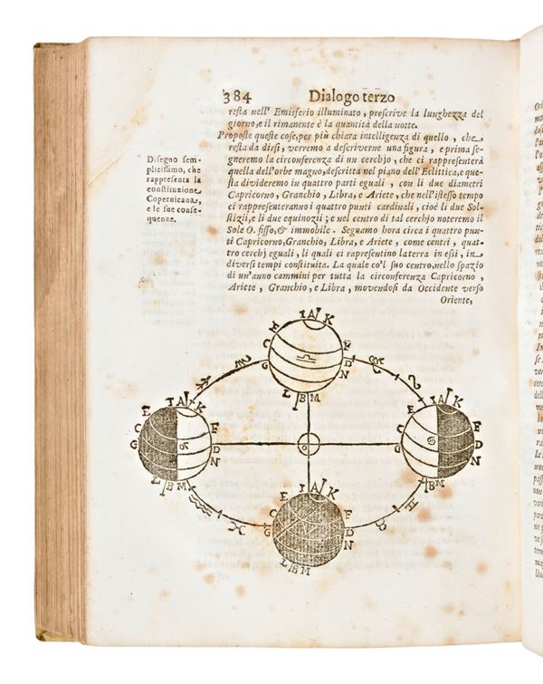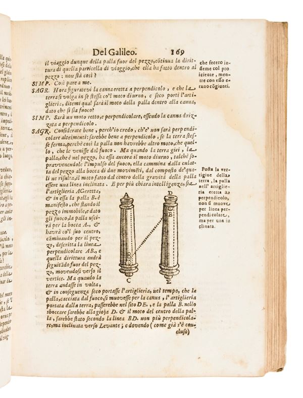 In-4°, mm. 225x170, pp. (12), 458, (2). Missing the Letter to the Grand Duchess of Tuscany, the leaves Gg2 and the last c. 4§⁴. Later binding (20th century) in full old flexible parchment with gold titles on a tag on the spine. Copy with wide margins, halo on the upper right corner of the leaves. Printer's device in chalcography on the front. (Printed in red and black). Some demonstrative graphs and woodcut figures in the text. Second edition of the Dialogo sopra i due massimi sistemi, printed in Naples in 1710 with the false location of Florence (see Parenti).