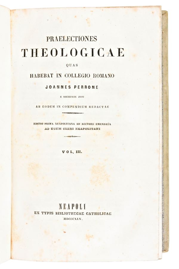 Title: Praelectiones Theologicae Quas habebat in Collegio Romano Joannes Perrone e Societate Jesu ab eodem in compendium redactae. Editio secunda neapolitana ab auctore emenda ad usum cleri neapolitani. Printed in Naples, ex tipis Bibliothecae Catholicae, 1845. Theology lessons by the Italian theologian Giovanni Perrone (1794-1876).